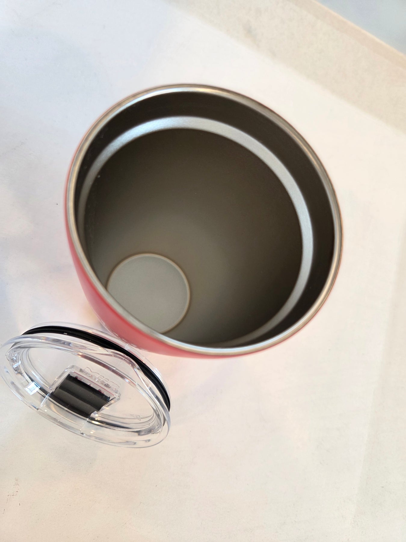 The perfect size for a proper cup, these 12 oz. high-quality MiiR cups are made from dual-wall stainless steel and have a travel lid with sliding closure. Keeps hot HOT and cold COLD!